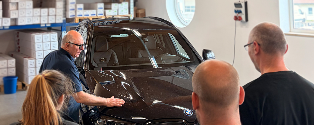 Natürlich kam auch die Praxis nicht zu kurz: Die Teilnehmer konnten die ORAGUARD® PPF 2815F+ Serie direkt verarbeiten und das Zusammenspiel aus Folie, Technik und Schneidesoftware live erleben. Dabei gab es jede Menge Tipps zur Verarbeitung und hilfreiche Tricks für ein wirtschaftliches und professionelles Ergebnis.